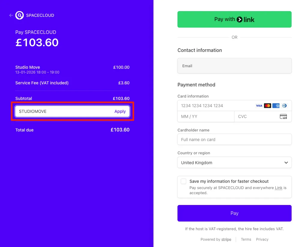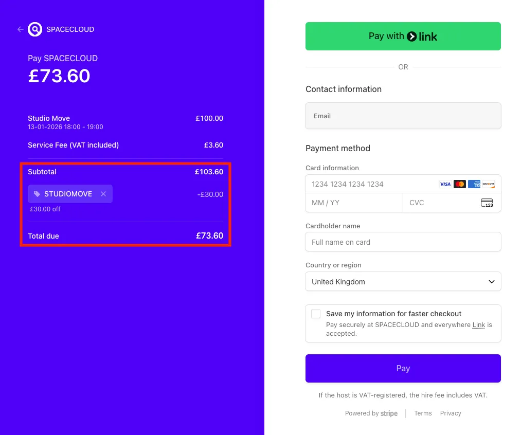When you proceed to the payment stage of your booking, you will be directed to the Stripe payment page. Please enter your promotion code in the field labelled [Add promotion code].