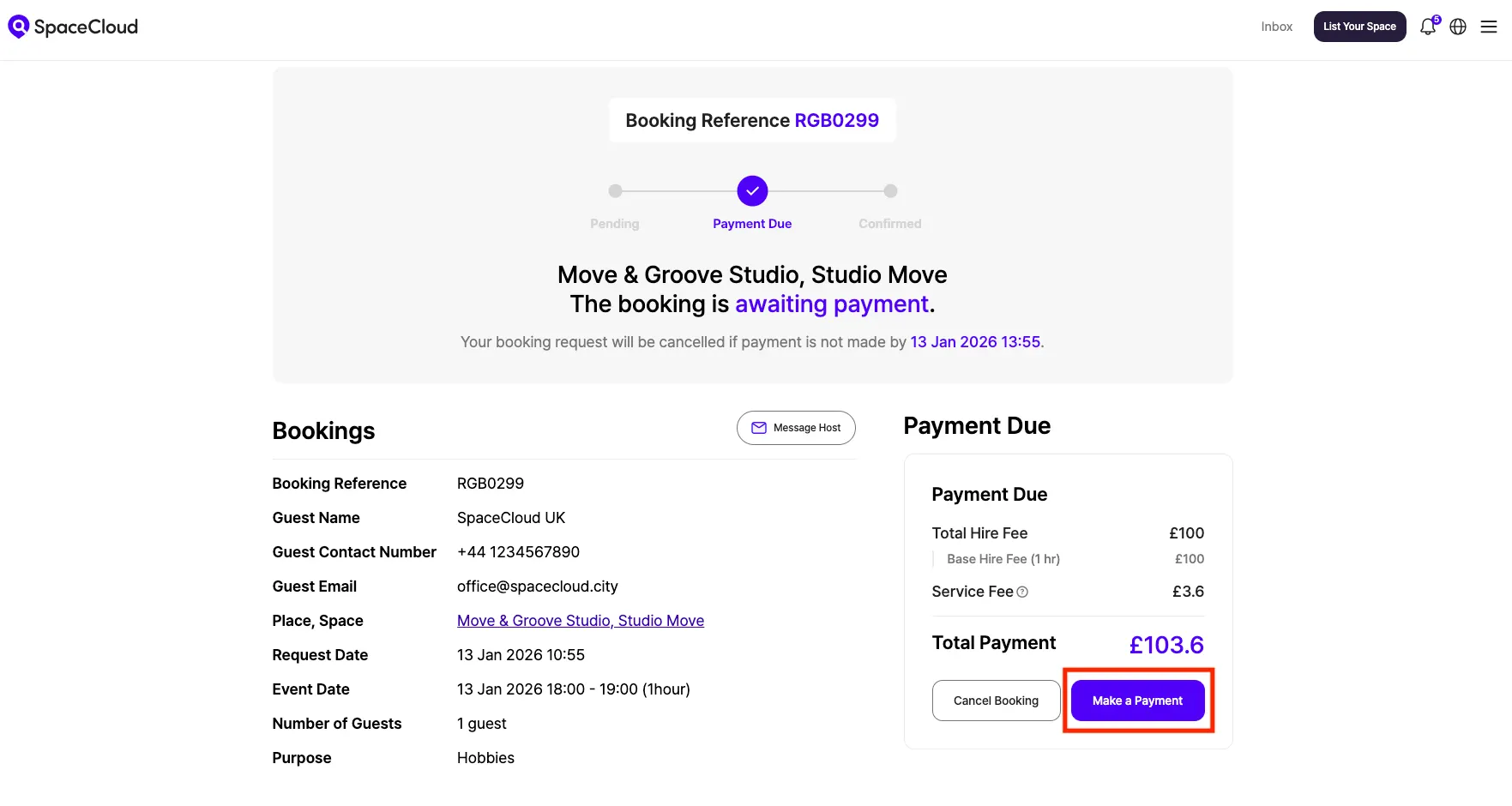 Once you’ve found a space you like, proceed with the booking and click the [Make a Payment] button.